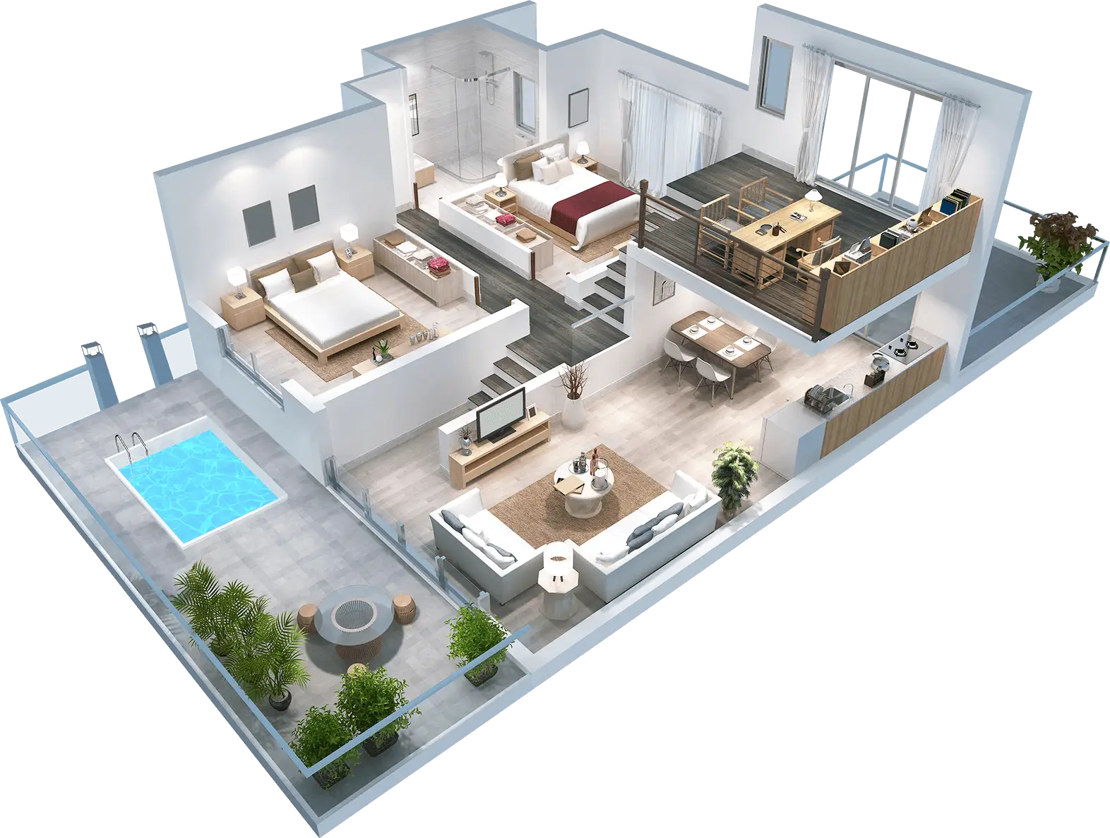 Experience a fresh perspective with captivating CGI top-down room views. Our advanced visualizations offer impressive overhead insights, unveiling details with exceptional clarity.
